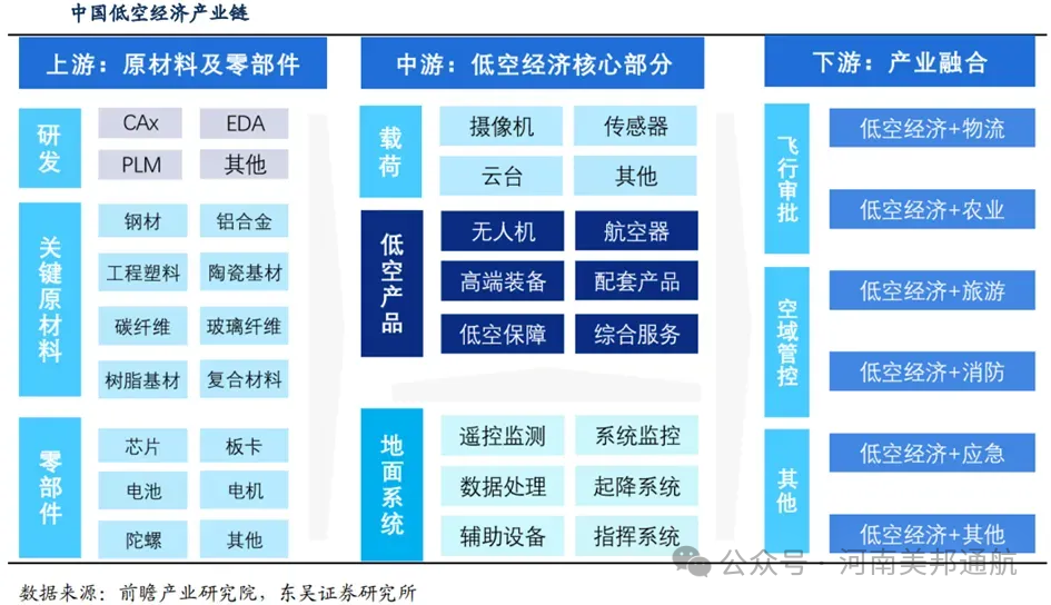 低空经济产业链上游构成产业基础层,涵盖航空器核心零部件、航电通信系统、关键材料等基础性产业环节,为整机制造和运营应用提供底层技术支撑。