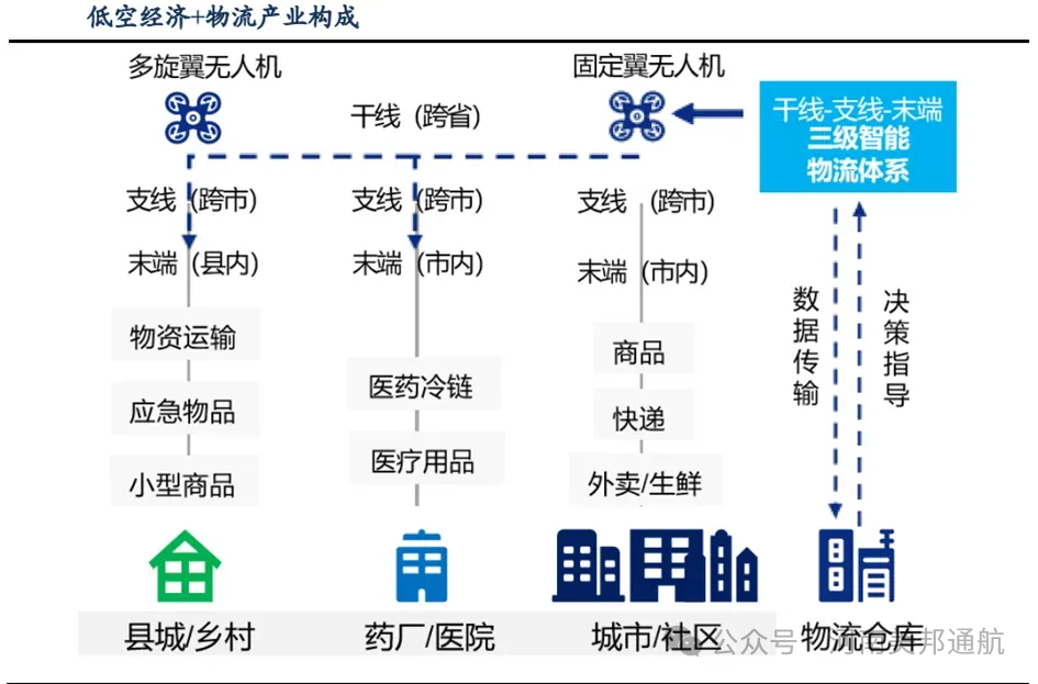 三级无人机智能物流网络:由干线、支线、末端三级构成,其中由物流无人机完成最后一公里的配送工作,也是物流无人机产业发展重点方向。