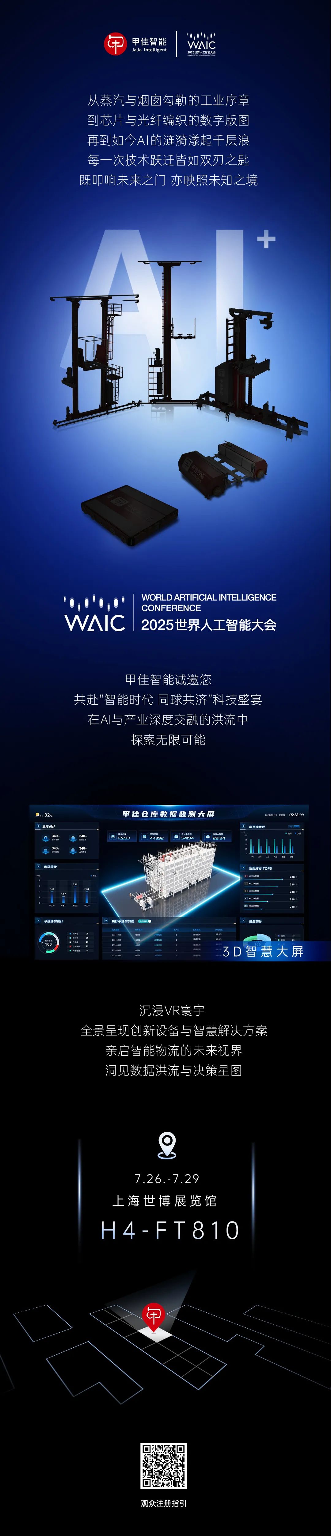 7月26日-29日,世界人工智能大会(WAIC 2025)将在上海举行。作为智能制造、物流设备及智能仓储领域的创新企业,甲佳智能将从硬件产品到软件系统,从方案到场景的全链路智能仓储解决方案,全面展示在智慧物流领域的技术积淀与产业实践。