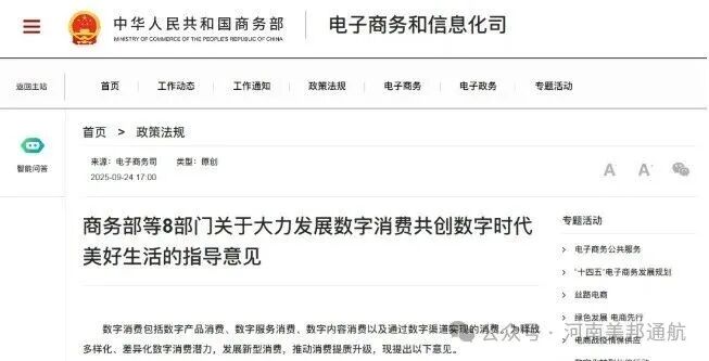 近日,商务部联合多部门印发《关于大力发展数字消费共创数字时代美好生活的指导意见》(以下简称《指导意见》)。文件立足超大规模市场优势,聚焦供需两侧协同发力,通过丰富供给、壮大主体、优化支撑、营造环境,推动数字消费更高水平供需平衡,为社会经济注入新活力 。
