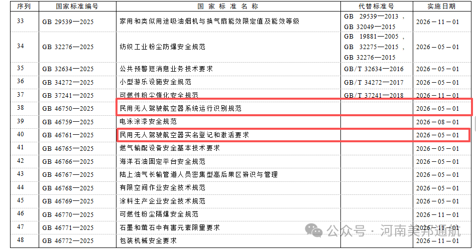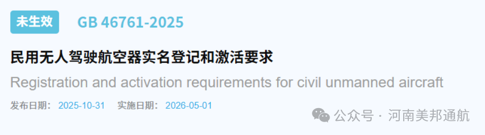 2025年11月4日,国家市场监督管理总局(国家标准化管理委员会)正式发布两项无人机强制性国家标准,为行业发展划定 “硬红线”。这两项标准分别是《民用无人驾驶航空器实名登记和激活要求》(GB 46761-2025)与《民用无人驾驶航空器系统运行识别规范》(GB 46750-2025),将于 2026年5月1日起全面实施。